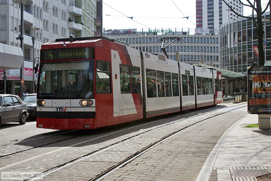 | Straßenbahn Ludwigshafen - 209 Triebwagen 209 auf Linie 4 nach Oggersheim, aufgenommen am 09. April 2010 bei der Haltestelle Berliner Platz. Photo: Claudia Wolf (info@claudia-blondie-wolf.de) Homepage: www.claudia-blondie-wolf.de |