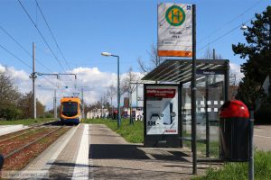 Triebwagen 2215 auf Linie 9 auf dem Weg in die Innenstadt an der Haltestelle Hans-Warsch-Platz, aufgenommen am 25. Januar 2017. Im Heckbereich wird nur die Linienbezeichnung angezeigt, jedoch nicht das Fahrtziel.