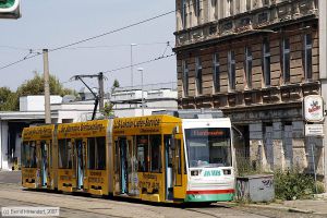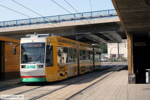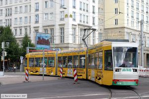 Triebwagen 1315 auf Linie 1 nahe dem Hauptbahnhof an der Haltestelle Damaschkeplatz, ZOB, aufgenommen am 05. August 2007.