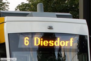 Linien- und Fahrtzielanzeige vorn am Triebwagen 1315, aufgenommen am 03. August 2007. Angezeigt wird 6 Diesdorf.