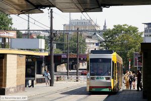 Triebwagen 1315 auf Linie 1 beim Hauptbahnhof bei der Haltestelle Damaschkeplatz, ZOB, aufgenommen am 05. August 2007.