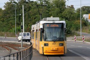 Triebwagen 213 auf Linie 51 nach Finthen - Poststraße bei der Abfahrt von der Haltestelle Jägerhaus, aufgenommen am 16. August 2011.