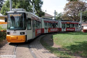 Triebwagen 215 als Linie 52 nach Bretzenheim - Bahnstraße, aufgenommen am 23. August 2011 in Mainz Hechtsheim in der Wendeschleife der Endstelle Am Schinnergraben.