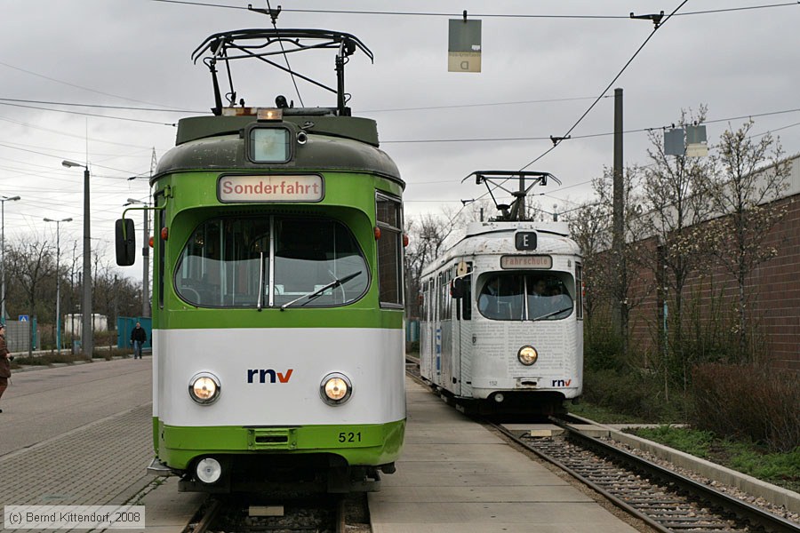| Straßenbahn Mannheim - 521 Triebwagen 521 auf dem Gelände des Betriebshofs in Ludwigshafen Rheingönheim, aufgenommen am 16. März 2008. Rechts im Bild steht Triebwagen 152 aus Ludwigshafen. Die Fahrzeugfronten unterscheiden sich in der Anzahl der Scheinwerfer. Photo: Bernd Kittendorf (info@bernd-kittendorf.de) Homepage: www.bernd-kittendorf.de |