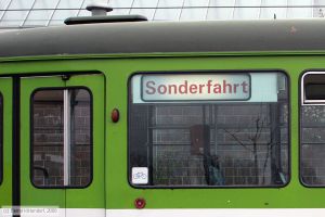 Seitliche Fahrtzielanzeige des Triebwagens 521 neben der hinteren Fahrgasttür in einem Seitenfenster, aufgenommen am 16. März 2008. Der Zielfilm zeigt in roter Schrift auf weißem Hintergrund das Wort Sonderfahrt. Übrigens gibt es einen Aufkleber mit Fahrrad-Symbol neben der Tür zum hochflurigen Fahrzeugteil.