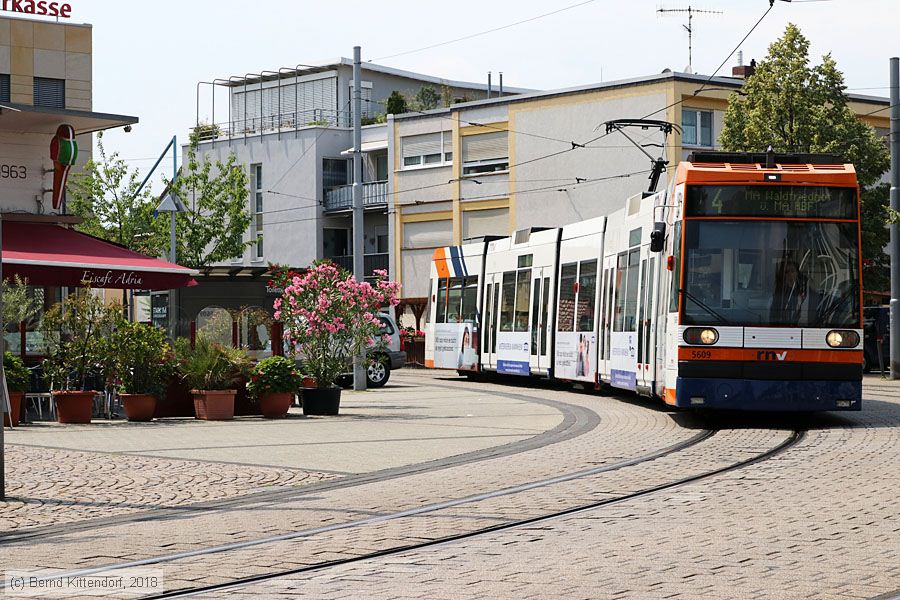 | Straßenbahn Mannheim - 5609 Triebwagen 5609 auf Linie 4 nach Mannheim Waldfriedhof in Ludwigshafen bei der Ankunft an der Haltestelle Hans-Warsch-Platz, aufgenommen am 09. Juni 2018. Photo: Bernd Kittendorf (info@bernd-kittendorf.de) Homepage: www.bernd-kittendorf.de |