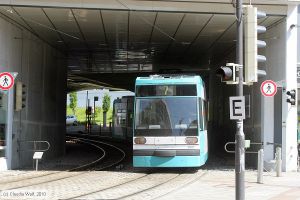 Triebwagen 5601 auf Linie 7 in Ludwigshafen bei der Haltestelle Berliner Platz auf dem Weg auf die Rheinbrücke, aufgenommen am 21. Mai 2010.