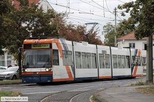 Triebwagen 5602 auf Linie 4 an der Endstelle in Ludwigshafen Oggersheim, aufgenommen am 06. August 2011. Das fünfteilige Fahrzeug hat eine Länge von 29,20 m und ist 2,40 m breit.