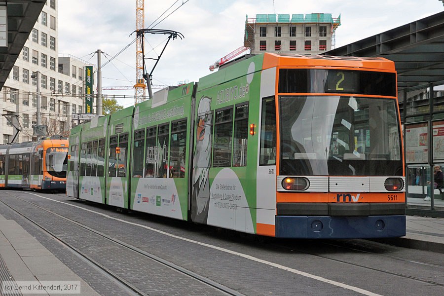 | Straßenbahn Mannheim - 5611 Triebwagen 5611 auf Linie 2 nach Feudenheim an der Haltestelle Mannheim Hauptbahnhof am Steig B, aufgenommen am 30. Oktober 2017. Die Linie wurde zu diesem Zeitpunkt umgeleitet. Photo: Bernd Kittendorf (info@bernd-kittendorf.de) Homepage: www.bernd-kittendorf.de |