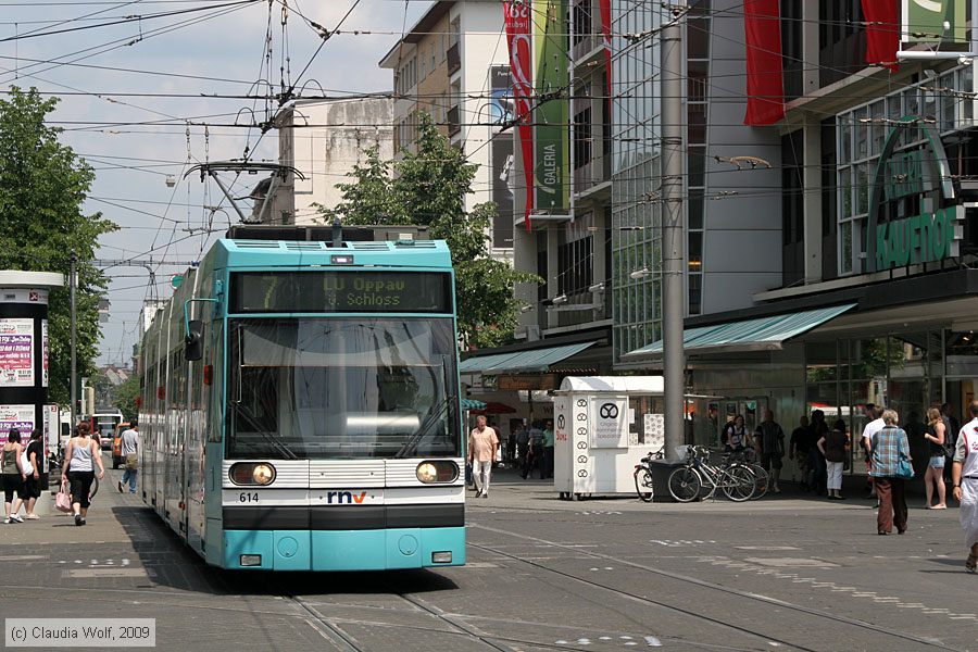 | Straßenbahn Mannheim - 614 Triebwagen 614 auf Linie 7 nach Ludwigshafen Oppau am Paradeplatz, aufgenommen am 02. Juli 2009. Photo: Claudia Wolf (info@claudia-blondie-wolf.de) Homepage: www.claudia-blondie-wolf.de |