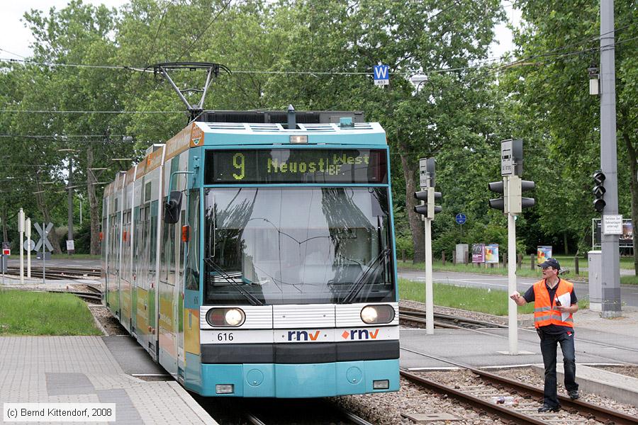 | Straßenbahn Mannheim - 616 Triebwagen 616 an der Haltestelle Luisenpark / Landesmuseum, aufgenommen am 17. Juni 2008. Die Linien- und Fahrtzielanzeige vorn am Fahrzeug wird gerade umgestellt. Photo: Bernd Kittendorf (info@bernd-kittendorf.de) Homepage: www.bernd-kittendorf.de |