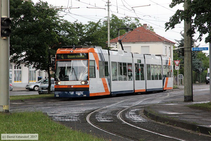 | Straßenbahn Mannheim - 5618 Triebwagen 5618 auf Linie 4 aus der Raiffeisenstraße kommend bei der Ankunft an der Endstelle in Ludwigshafen Oggersheim, aufgenommen am 03. Juni 2017. Photo: Bernd Kittendorf (info@bernd-kittendorf.de) Homepage: www.bernd-kittendorf.de |