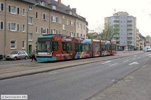 Triebwagen 618 auf Linie 3 nach Sandhofen in Ludwigshafen bei der Haltestelle Schopenhauerstraße, aufgenommen am 31. Juli 2008.