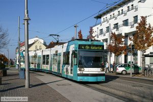 Triebwagen 618 auf Linie 4 an der Endstelle in Ludwigshafen Oggersheim, aufgenommen am 10. September 2008 bei der Fahrt in die Wendeschleife.