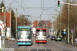 Triebwagen 624 auf Linie 4 in der Raiffeisenstraße bei der Ankunft an der Endstelle in Ludwigshafen Oggersheim, aufgenommen am 17. März 2004. Rechts davon ist Triebwagen 1041 der RHB zu sehen.