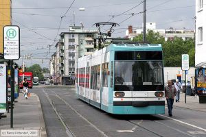 Triebwagen 631 auf Linie 4 an der Haltestelle Ludwigshafen Oggersheim, aufgenommen am 12. August 2007. Das Material links im Bild gehört zu Bauarbeiten an der Rhein-Haardtbahn-Haltestelle.