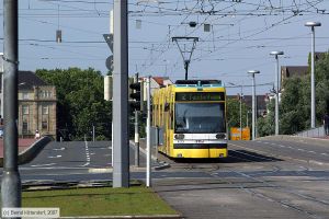 Triebwagen 633 auf Linie 7 nach Vogelstang zwischen den Haltestellen Hauptbahnhof und Kunsthalle, aufgenommen am 11. März 2007. Der 1995 von Duewag gebaute Triebwagen ist hier in seiner ursprünglichen Farbgebung zu sehen.