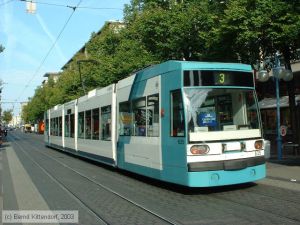Triebwagen 635 auf Linie 3 nach Sandhofen bei der Abfahrt vom Hauptbahnhof, aufgenommen am 06. Mai 2005.