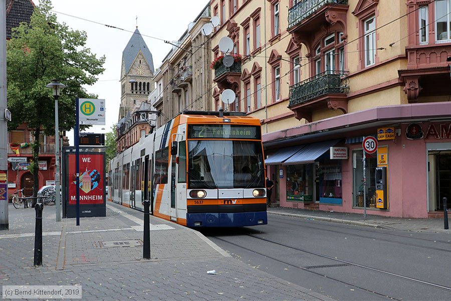 | Straßenbahn Mannheim - 5637 Triebwagen 5637 auf Linie 2 nach Feudenheim in der Mittelstraße an der Haltestelle Neumarkt, aufgenommen am 08. Juli 2019 mit der katholischen Herz-Jesu-Kirche im Hintergrund. Photo: Bernd Kittendorf (info@bernd-kittendorf.de) Homepage: www.bernd-kittendorf.de |