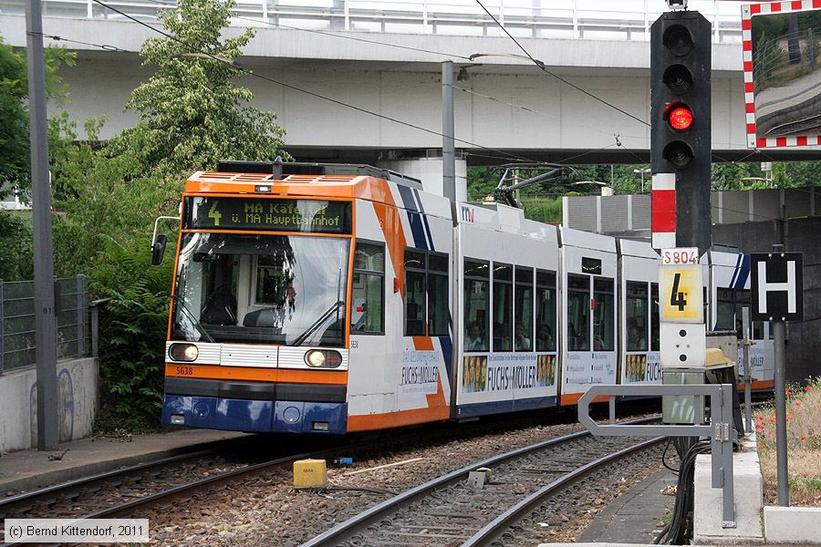 | Straßenbahn Mannheim - 5638 Triebwagen 5638 auf Linie 4 nach Mannheim Käfertal in Ludwigshafen bei der Ankunft an der Haltestelle Bürgermeister-Kutterer-Straße, aufgenommen am 31. Mai 2011. Der Zug ist gerade aus dem Tunnel beim Hauptbahnhof gekommen. Photo: Bernd Kittendorf (info@bernd-kittendorf.de) Homepage: www.bernd-kittendorf.de |