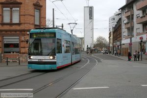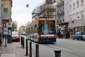 Triebwagen 5639 auf Linie 6 nach Rheingönheim in Ludwigshafen bei der Abfahrt von der Haltestelle Am Schwanen, aufgenommen am 17. November 2010.