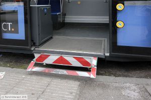 Rollstuhlhublift an der ersten Tür des Triebwagens 2114 in Aktion an der Haltestelle Gondrellplatz, aufgenommen am 18. Dezember 2016. Die Rampe ist ausgefahren und die Plattform abgesenkt, nun kann der Rollstuhlfahrer auf die Plattform rollen. Der Zug steht bereit zur Abfahrt auf Linie 18 zum Effnerplatz.