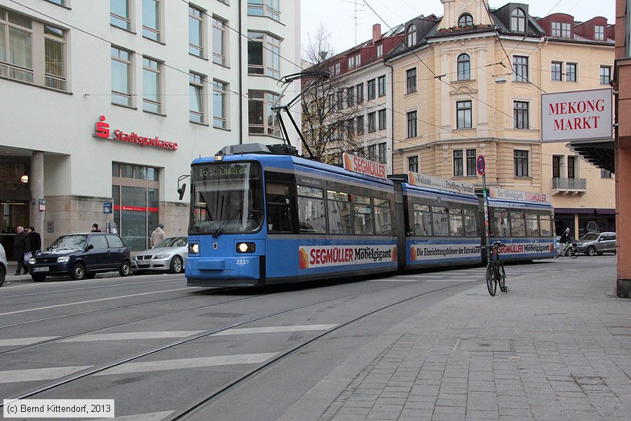 | München - Straßenbahn - 2119 Triebwagen 2119 auf Linie 16 nach St. Emmeram bei der Haltestelle Müllerstraße, aufgenommen am 28. November 2013. Der Zug fährt auf dem mittleren Gleis. Das Gleis links im Bild wird von der Linie 17 in Richtung Schwanseestraße benutzt und zweigt an der Haltestelle in die Fraunhoferstraße ab. Photo: Bernd Kittendorf (info@bernd-kittendorf.de) Homepage: www.bernd-kittendorf.de |