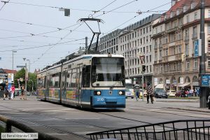 Triebwagen 2110 auf Linie 16 nach St. Emmeram bei der Abfahrt von der Haltestelle Sendlinger Tor, aufgenommen am 12. Mai 2015.