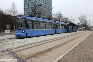 Triebwagen 2121 auf Linie 25 nach Berg am Laim Bahnhof in der Wendeschleife an der Endstelle, aufgenommen am 16. Dezember 2016. Die am 10. Dezember 2016 eröffnete neue Strecke zwischen Max-Weber-Platz und hier hat eine Länge von 2,7 km, davon wurden 1,3 km neu gebaut. Der Rest war als Zufahrt zum Betriebshof an der Einsteinstraße schon vorhanden.