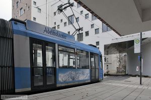 Triebwagen 2214 nach einer Fahrt auf Linie 21 an der Haltestelle Hochschule München in der Wendeschleife, aufgenommen am 19. Dezember 2016. Die Fahrtzielanzeige im Heck wurde soeben auf Lothstraße umgestellt. Dieser vierteilige, achtachsige Triebwagen in Einrichtungsbauart gehört zum Typ R3.3 und wurde im Jahr 2001 von Adtranz gebaut.