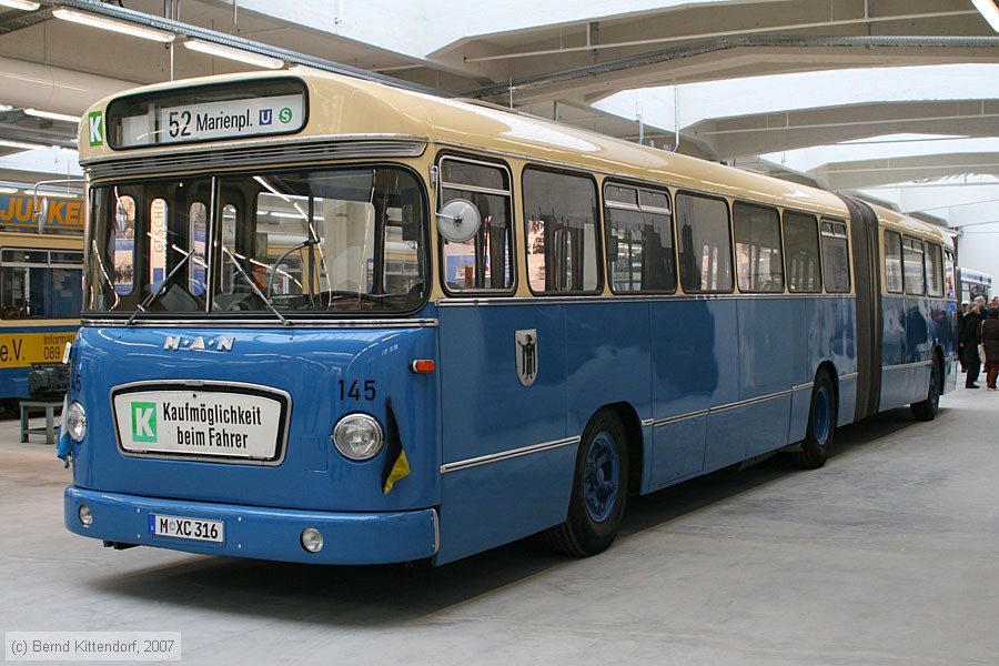 | München - MVG Museum - 145 Gelenkbus 145 im MVG Museum, aufgenommen am Eröffnungstag 27. Oktober 2007. Das dreiachsige Fahrzeug ist ein MAN/Göppel 890 UG M 16 A aus dem Jahr 1965. Photo: Bernd Kittendorf (info@bernd-kittendorf.de) Homepage: www.bernd-kittendorf.de |