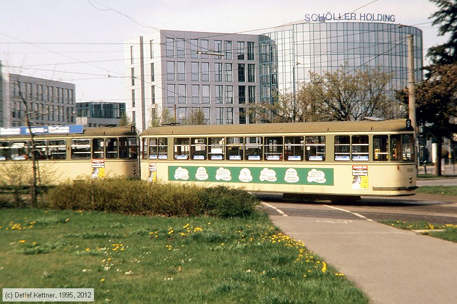 | Straßenbahn Nürnberg - 1569 Beiwagen 1569 (Hersteller MAN, Baujahr 1963) auf Linie 9, aufgenommen am 23. April 1995. Photo: Detlef Kettner, Scan: Bernd Kittendorf (info@bernd-kittendorf.de) Homepage: www.bkcw-bahnbilder.de |