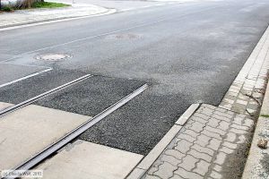 Gleise in der Wiesenstraße in Richtung der früheren Straßenbahn-Haltestelle auf dem Vorplatz des Unteren Bahnhofs, aufgenommen am 14. April 2010.