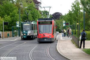 Triebwagen 407 auf Linie 95 nach Babelsberg Fontanestraße an der Haltestelle Puschkinallee, aufgenommen am 18. Mai 2005. Links im Bild ist Triebwagen 159 auf Linie 95 nach Bornstedter Feld - Viereckremise zu sehen. Und rechts im Bild ist mein Freund Detlef ebenfalls dabei, ein Foto zu machen.