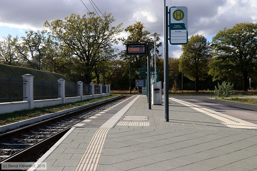 | Straßenbahn Potsdam - Anlagen Bahnsteig für den Einstieg der Haltestelle Campus Jungfernsee der Linie 96, aufgenommen am 24. Oktober 2018. Von hier erfolgt die Abfahrt nach Kirchsteigfeld - Marie-Juchacz-Straße. Der Bahnsteig ist über flache Rampen zugänglich und hat einen taktilen Leitstreifen. Der Bussteig rechts im Bild dient nur für den Ausstieg. Photo: Bernd Kittendorf (info@bernd-kittendorf.de) Homepage: www.bernd-kittendorf.de |