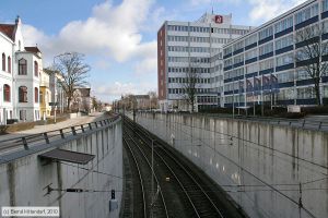 Rampe am Tunnel zur Haltestelle Hauptbahnhof, aufgenommen am 16. März 2010 mit dem Empfangsgebäude im Hintergrund.