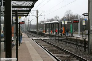 Straßenbahn-Haltestelle Marienehe mit dem S-Bahn Haltepunkt rechts im Hintergrund, aufgenommen am 15. März 2006.