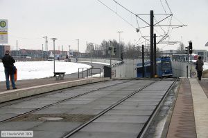 Haltestelle Bertold-Brecht-Straße, aufgenommen am 16. März 2006. Nach rechts im Bild führt die Strecke weiter zur Haltestelle Ehm-Welk-Straße.