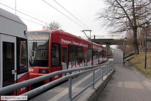 Triebwagen 804 (links im Bild) und Triebwagen 826 (rechts davon) auf Linie 2 an der Haltestelle Gartenstadt, aufgenommen am 19. März 2010.