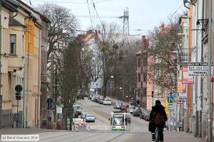 Triebwagen 805 auf Linie 1 zur Hegelstraße nahe der Haltestelle Schlossblick, aufgenommen am 22. Februar 2014.