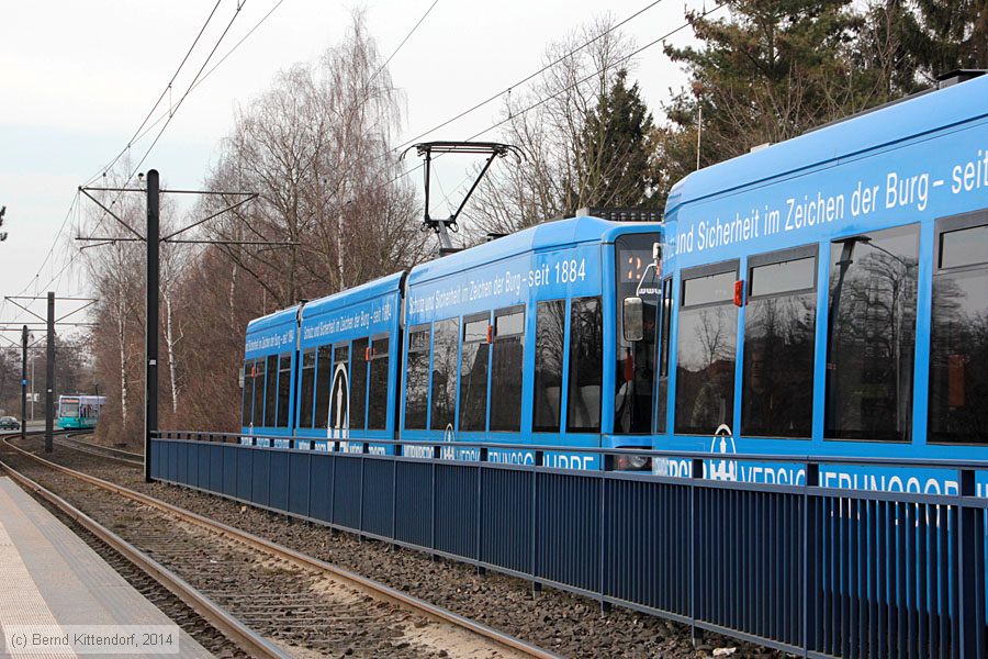 | Straßenbahn Schwerin - 806 Triebwagen 806 mit Triebwagen 818 (zweites Fahrzeug im Zug, rechts am Bildrand) auf Linie 2 zur Lankow-Siedlung bei der Abfahrt von der Haltestelle Ostorf, aufgenommen am 26. Februar 2014. Photo: Bernd Kittendorf (info@bernd-kittendorf.de) Homepage: www.bernd-kittendorf.de |