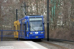 Triebwagen 814 auf Linie 2 in der Wendeschleife bei der Haltestelle Hegelstraße, aufgenommen am 19. März 2010.