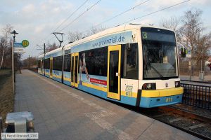 Triebwagen 815 auf Linie 3 nach Neu Pampow an der Haltestelle Hegelstraße am Bahnsteig für den Einstieg, aufgenommen am 19. März 2010.