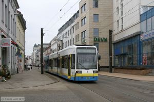 Triebwagen 817 mit Triebwagen 812 (links am Bildrand) auf Linie 2 zur Lankow-Siedlung bei der Abfahrt von der Haltestelle Platz der Freiheit, aufgenommen am 09. März 2016. Durch Gurte und ein Schild entsprechend dem Zeichen 259 Verbot für Fußgänger der Straßenverkehrs-Ordnung oberhalb der Kupplung sollen Menschen davon abgehalten werden, über die Kupplung zu klettern.