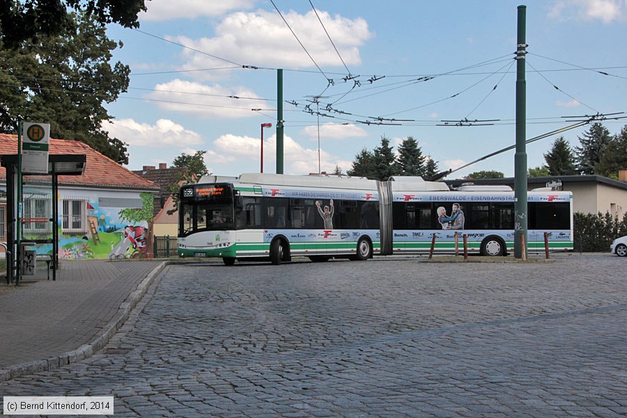 | Eberswalde - O-Bus - 056 Gelenk-Oberleitungsbus 056 auf Linie 862 in der Wendeschleife an der Endstelle Ostend, aufgenommen am 22. Juli 2014. Die Haltestelle für den Einstieg ist links am Bildrand zu sehen. Photo: Bernd Kittendorf (info@bernd-kittendorf.de) Homepage: www.bernd-kittendorf.de |