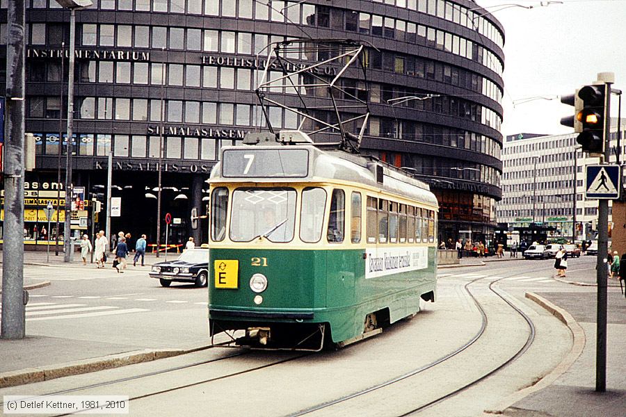 | Helsinki - Straßenbahn - 21 Triebwagen 21 auf Linie 7, aufgenommen am 12. Juni 1981. Dieses Fahrzeug wurde 1959 in Betrieb genommen und 2002 ausgesondert. Photo: Detlef Kettner, Scan: Bernd Kittendorf (info@bernd-kittendorf.de) Homepage: www.bkcw-bahnbilder.de |