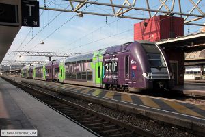 Doppelstock-Triebwagen Zx 24766 (Set 633) im Bahnhof Lyon Part-Dieu auf Gleis J, aufgenommen am 01. Mai 2014. Diese Fahrzeuge werden als TER 2N NG (2N für deux niveaux und NG für nouvelle génération) bezeichnet.