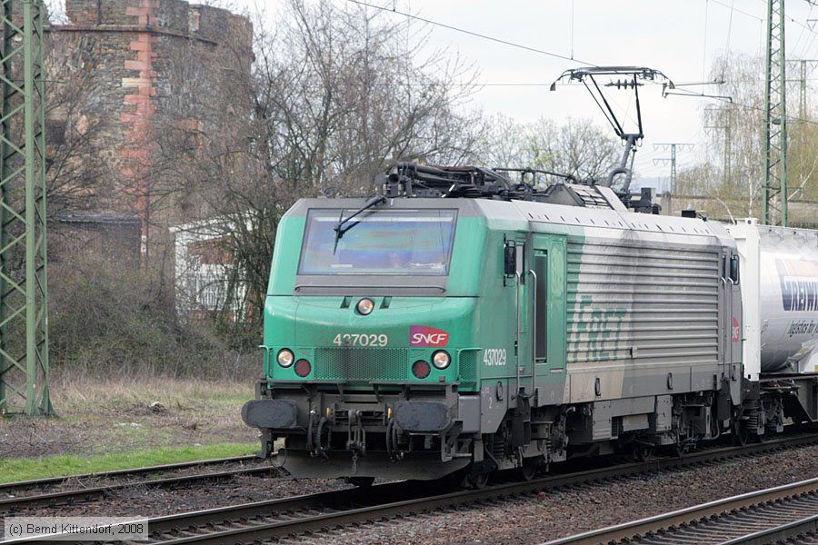| SNCF - 437029 Lok 437029 in Koblenz-Lützel, aufgenommen am 03. April 2008. Die Lokomotive BB 37029 ist seit November 2004 im Bestand. Sie ist hier in der Farbgebung für Fret zu sehen. Photo: Bernd Kittendorf (info@bernd-kittendorf.de) Homepage: www.bernd-kittendorf.de |