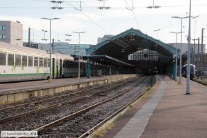Bahnsteige und Gleise im Bahnhof von Le Havre, aufgenommen am 08. Mai 2014 bei Dauerregen.