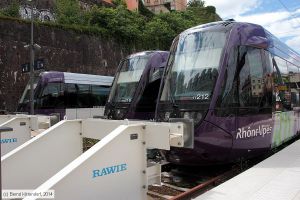 Die Gleisenden im Kopfbahnhof Lyon Saint-Paul werden von Produkten des Herstellers Rawie gesichert. Die Aufnahme ist am 29. Juni 2014 entstanden. Von links nach rechts warten hier Triebwagen TT213, TT218 und TT212 aus der Serie U 52501/U 52502 - U 52547/U 52548 (Tram-train Citadis Dualis) der SNCF.